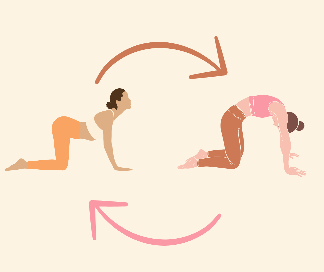 - Cat-Cow Pose (Marjaryasana-Bitilasana): This dynamic pose helps to gently stretch and mobilise the spine, promoting relaxation and flexibility. For Cat-Cow, begin on your hands and knees in a tabletop position, with your wrists directly under your shoulders and knees under your hips. As you inhale, arch your back and lift your chest and tailbone towards the ceiling, allowing your belly to sink towards the floor (Cow Pose). As you exhale, round your spine and tuck your chin towards your chest, drawing your belly button towards your spine (Cat Pose). Flow smoothly between these two poses, syncing your breath with your movements.